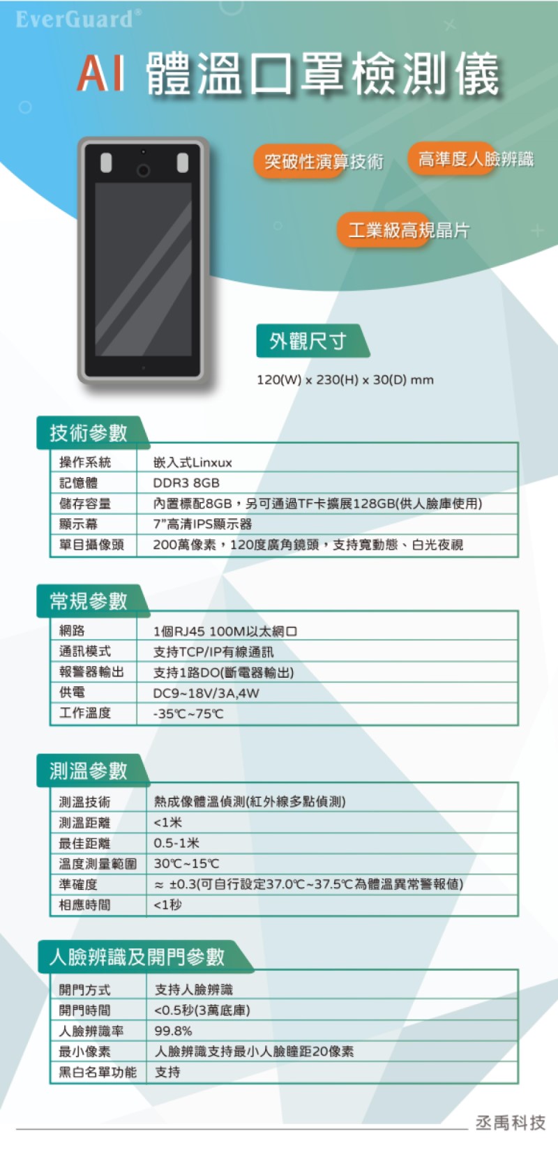 體溫檢測: 精度 ±0.3°C,距離30~50cm
